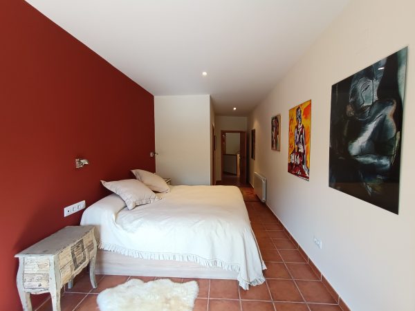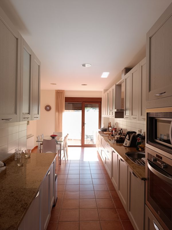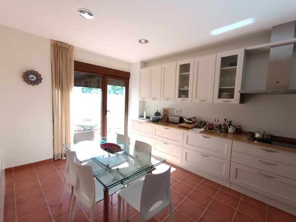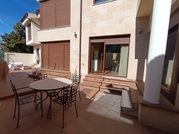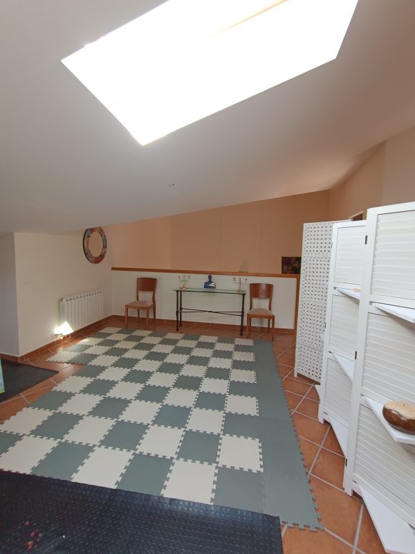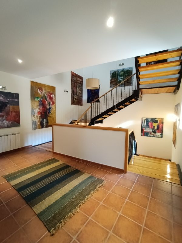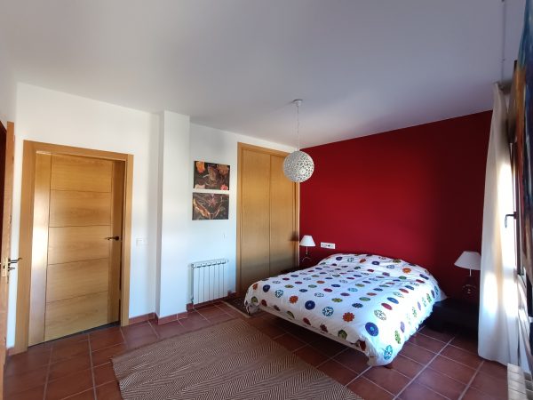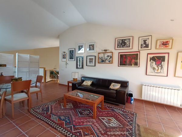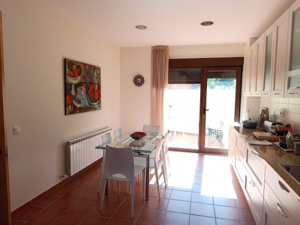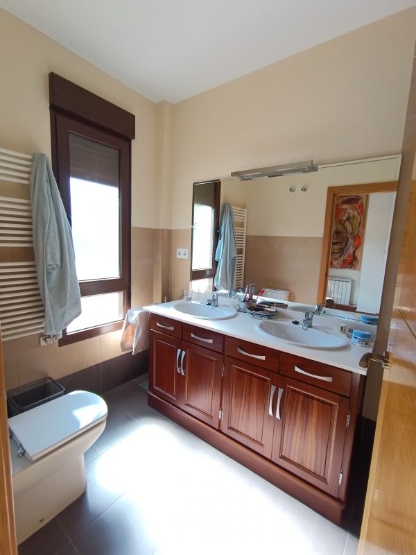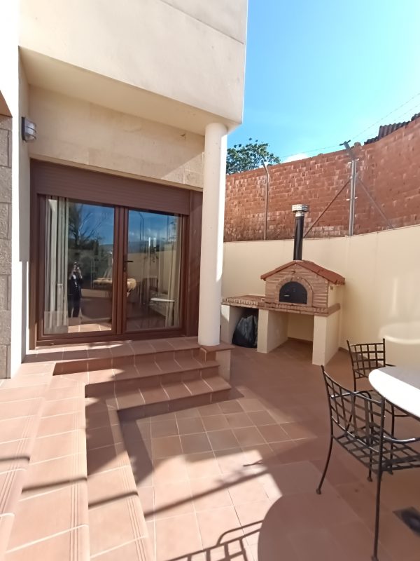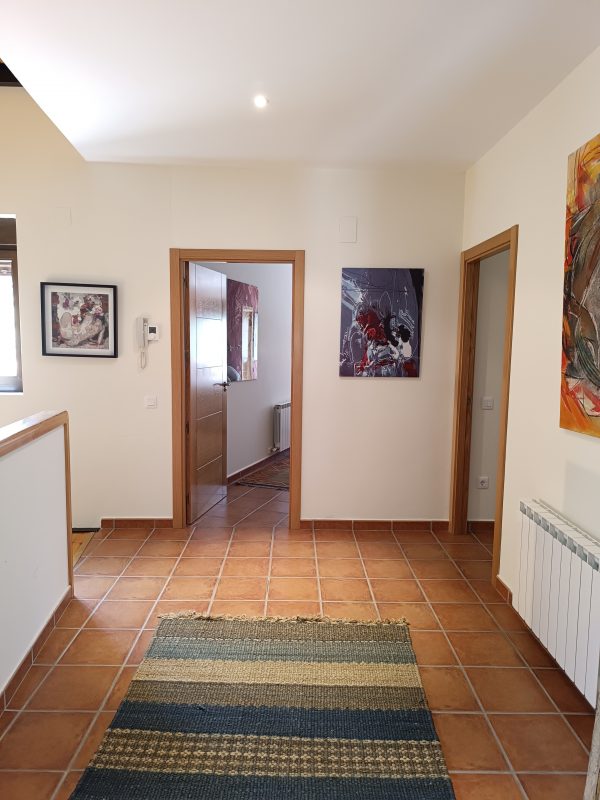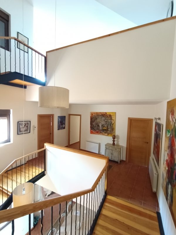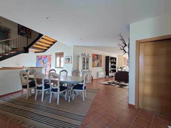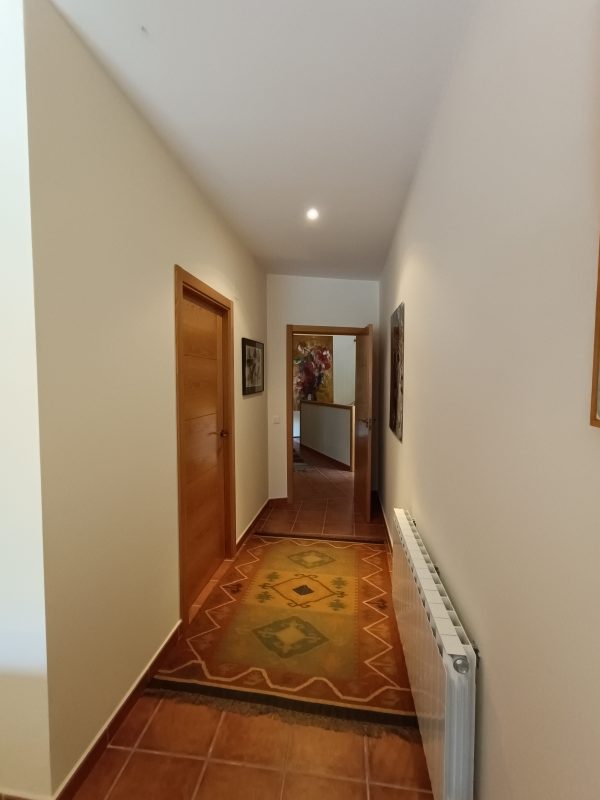 Se trata de una vivienda de 417 m2 construidos, divididos en dos plantas, una buhardilla y un garaje. En la planta baja (115 m2) se ubica la cocina independiente, equipada y con salida al patio, un amplio salón-comedor con chimenea de casette (y salida al patio) y un aseo. El patio tiene una superficie de 43 m2, se encuentra solado y dispone de horno de leña. En la primera planta (118 m2), se ubican los 3 dormitorios (uno de ellos con vestidor). Cada uno de ellos tiene armario empotrado y cuarto de baño. La buhardilla (87 m2) se trata de un amplio espacio diáfano, como sala de estar, estudio, etc. Además, cuenta con cuarto de baño con bañera con preciosas vistas y un cuarto/almacén.