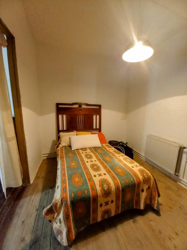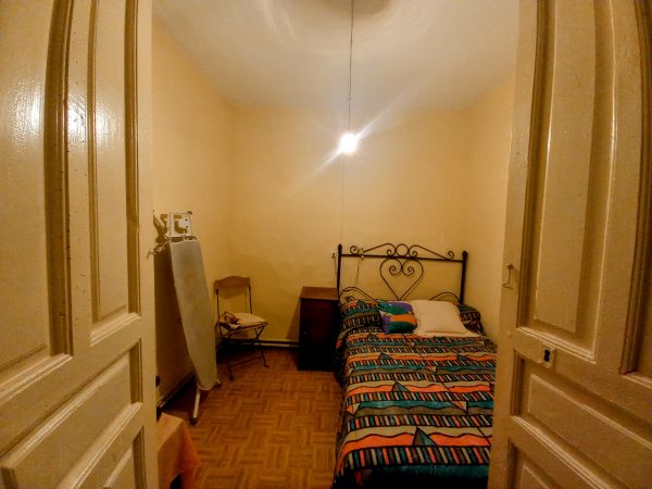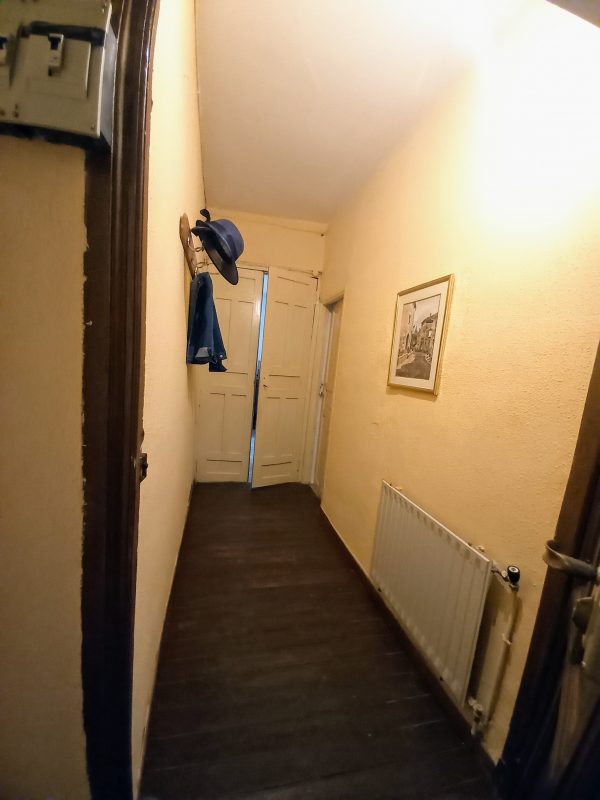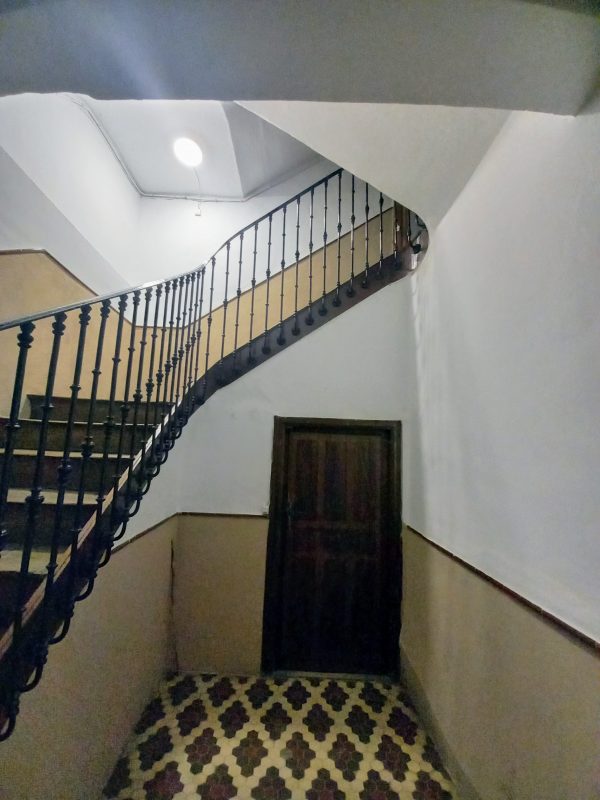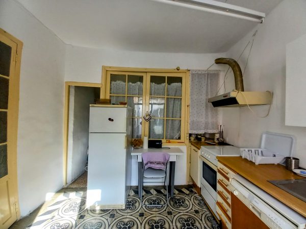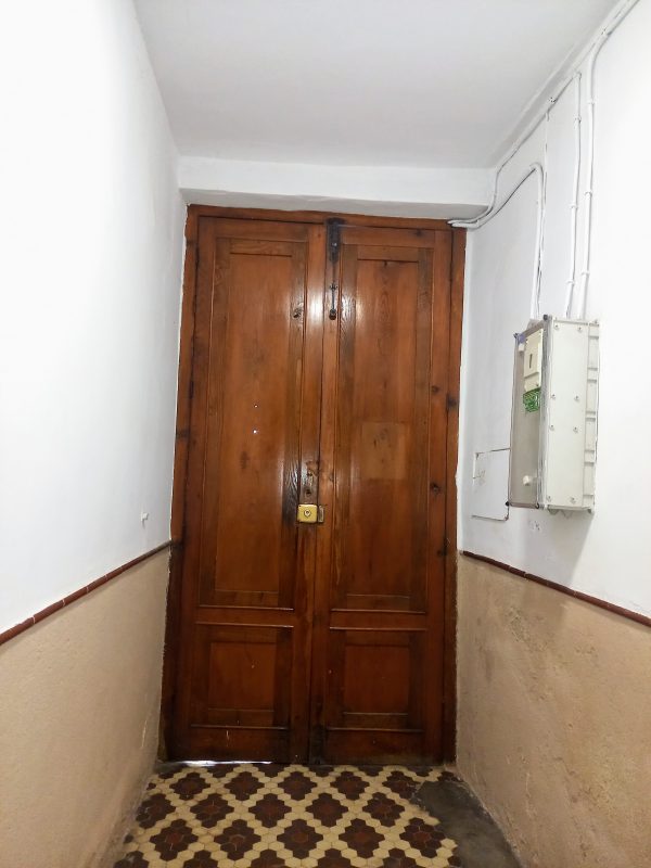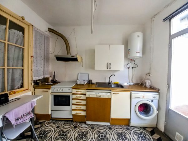 En el interior encontramos una sala con alcoba, actualmente usada como salón y dormitorio, que tiene salida directa a un balcón con vistas al patio. La cocina, amplia y práctica, incluye despensa y acceso a una terraza, donde se ubican un aseo y el cuarto de calderas.