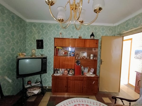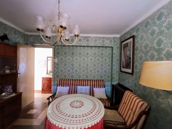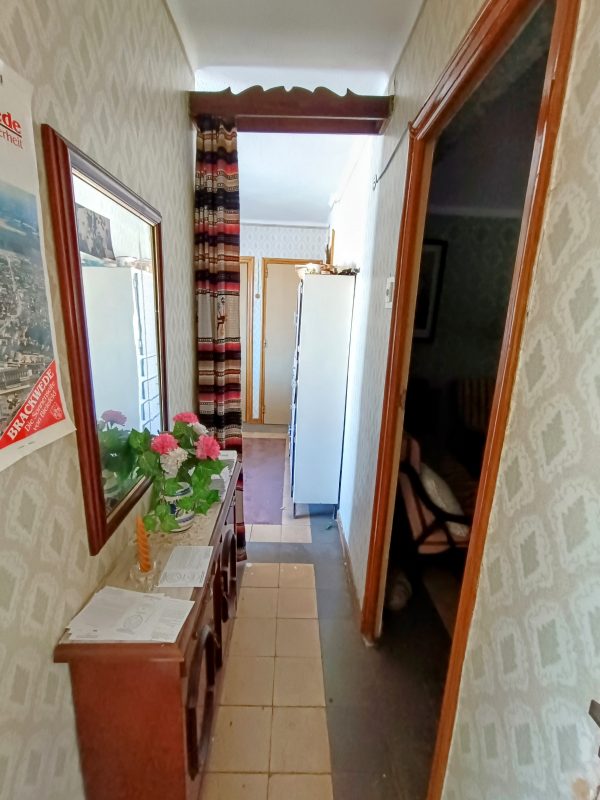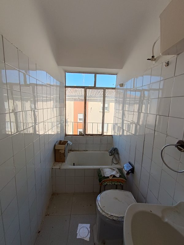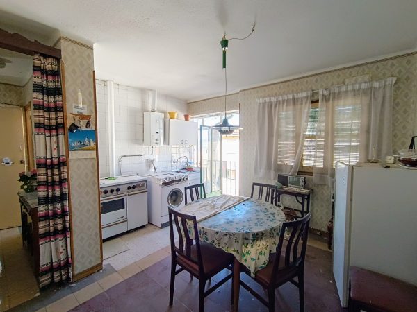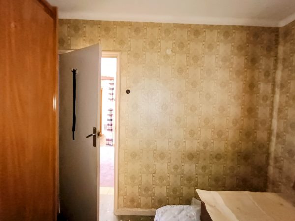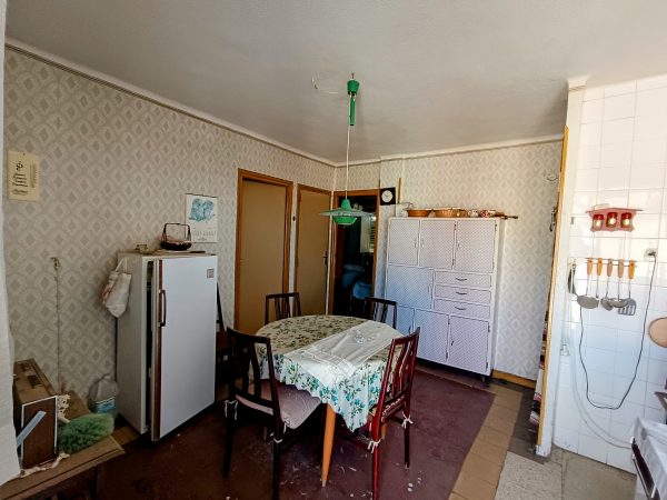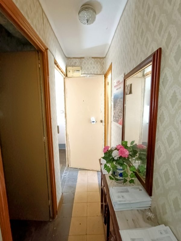 Se trata de un piso de 56 metros cuadrados, que consta de vestíbulo, cocina-comedor-estar con salida a un balcón, tres dormitorios, cuarto de baño y despensa. Tiene los suelos de terrazo y los cerramientos de madera. Todas las estancias son exteriores, ya que tiene luces a dos calles. Además, cuenta con toma de gas. Se ubica en la segunda planta de un edificio del año 1955, compuesto de tres plantas (bajos, primeros y segundos) con dos vecinos por planta. Debido al paso del tiempo y a su desocupación desde años, su estado de conservación se ha ido progresivamente deteriorando. Requiere una reforma completa.