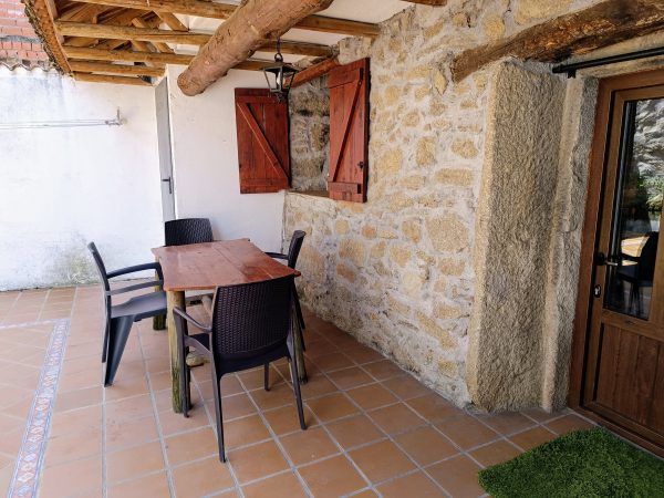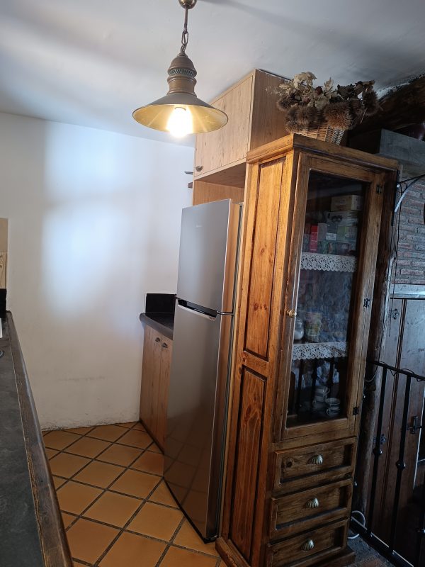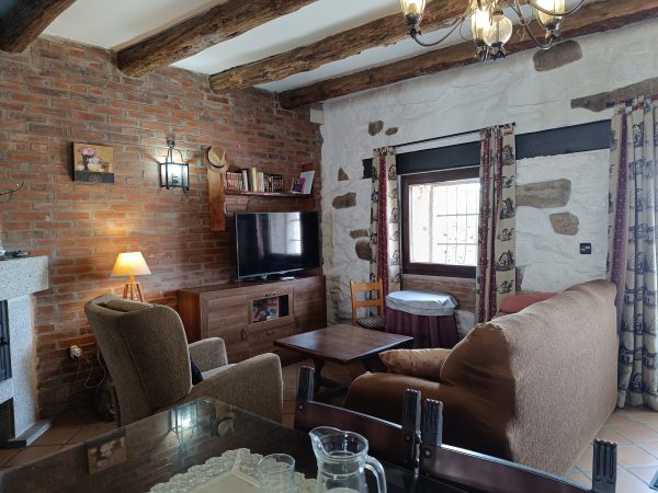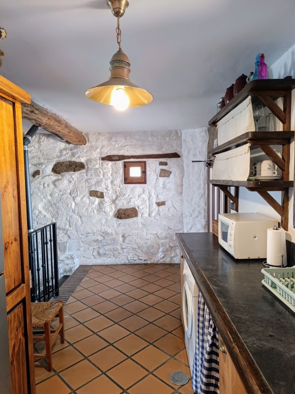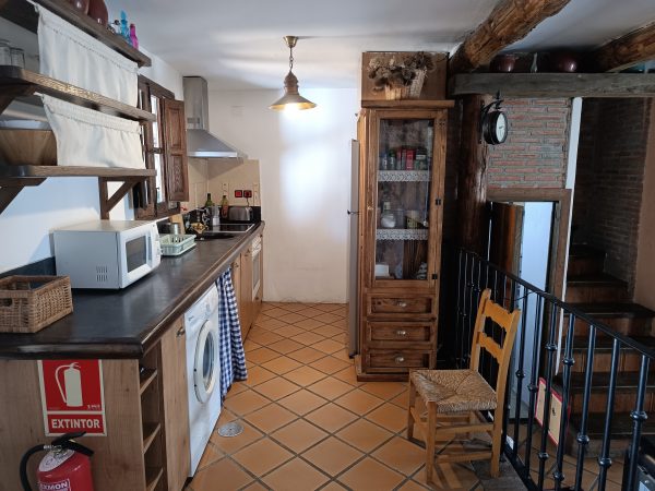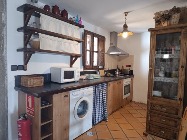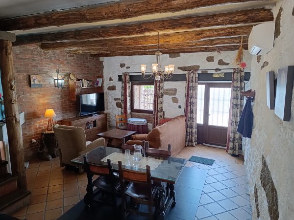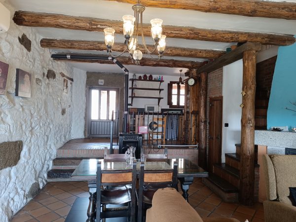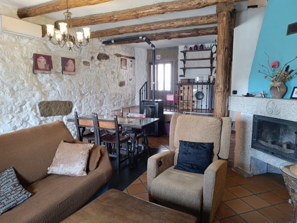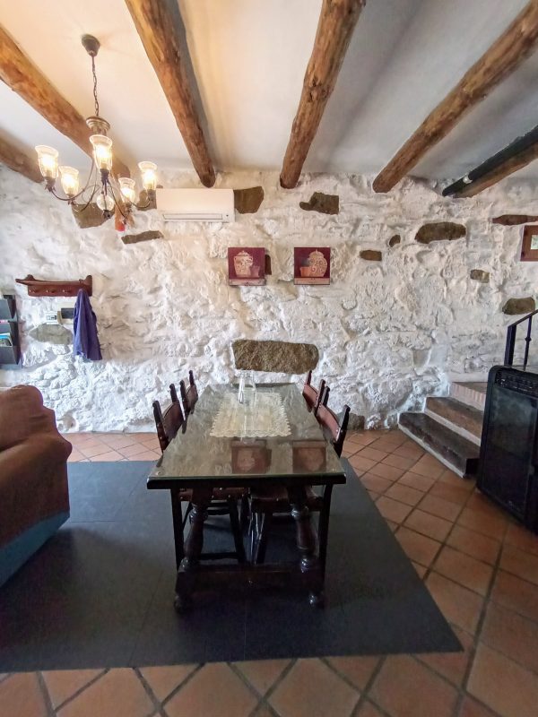 En la planta baja (44 m2), se encuentra el amplio salón-comedor con chimenea de leña, perfecto para pasar tiempo con la familia y amigos, así como una cocina completa que cuenta con todo lo necesario. También hay un aseo y el acceso a un espléndido patio de unos 28 m2, solado, con zona de barbacoa, salida directa a la calle y con puntos de luz y agua. Está planta tiene los suelos de gress, techos de madera y paredes de piedra.