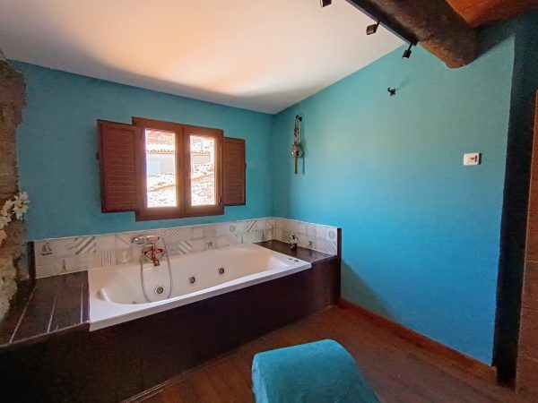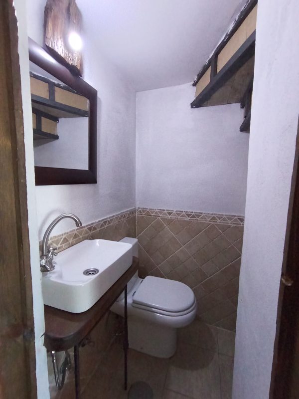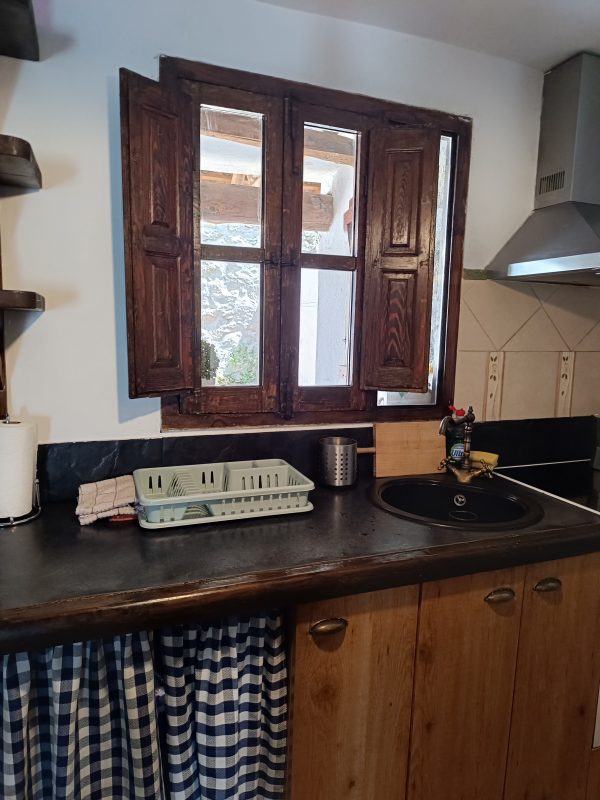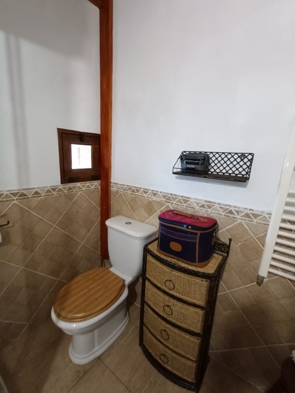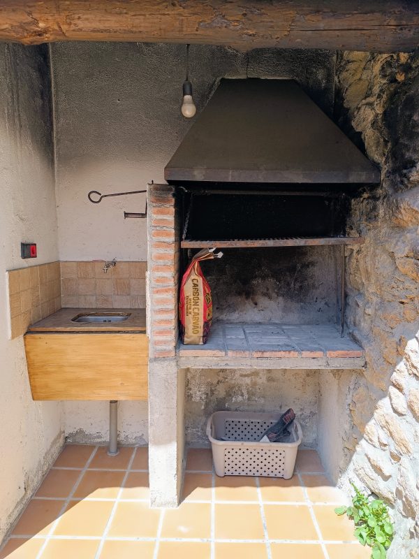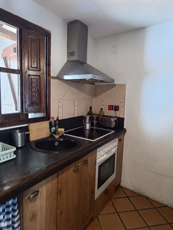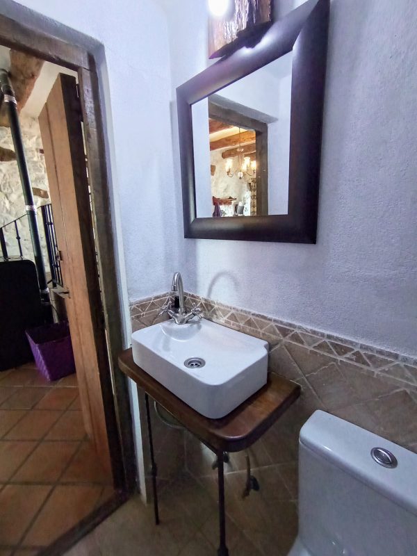 En la planta baja (44 m2), se encuentra el amplio salón-comedor con chimenea de leña, perfecto para pasar tiempo con la familia y amigos, así como una cocina completa que cuenta con todo lo necesario. También hay un aseo y el acceso a un espléndido patio de unos 28 m2, solado, con zona de barbacoa, salida directa a la calle y con puntos de luz y agua. Está planta tiene los suelos de gress, techos de madera y paredes de piedra.