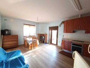 Acogedor salón-cocina diáfano con chimenea, ideal para el invierno.